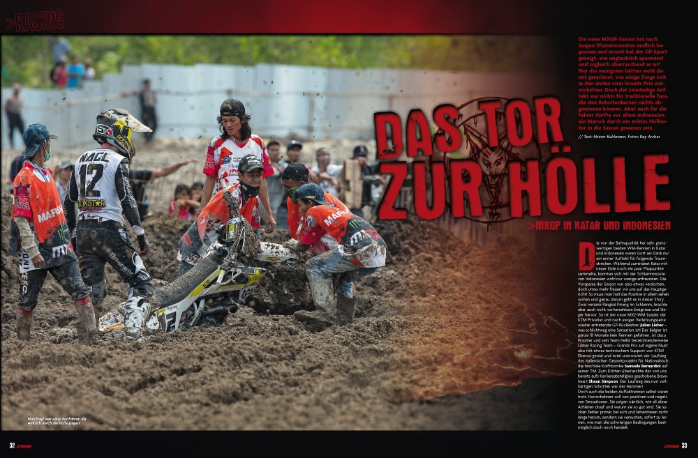 Auweia! Was war das für ein WM-Auftakt auf den Retorten-Kursen von Katar und Indonesien. Ganz besonders der zweite Auftritt in Pangkal Pinang, der für die Teilnehmer und Teilnehmerinnen eher einem Höllenritt glich. Man musste kein Hellseher sein um zu erahnen, dass ein Grand Prix während der Regenzeit eine recht feuchte Angelegenheit werden dürfte, doch der dazu aus Lehm frisch aus dem Boden gestampfte Track ließ das Fass der Teilnehmer zum Überlaufen bringen. Welche Überraschungen dieser Auftakt hervorbrachte, warum Bilder manchmal mehr als 1.000 Worte sagen und was die besondere Psyche der Fahrer damit zu tun hat, erfahrt ihr in unserer Story vom „Tor zur Hölle“, auch GP Auftakt genannt.