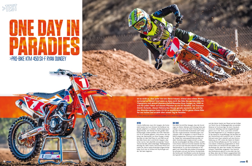Apropos Traum-Bikes: Dass das Bike vom aktuellen US-SX-Champ Ryan Dungey wohl nicht das schlechtestes sein wird, davon ist auszugehen. Dieses Motorrad ist aber eine echte Bombe, was wohl selbst unser Teilzeit-Tester Dimitri Rolando in dieser Form nicht erwartet hätte. Für ihn war dieser Testtag wie im Paradies, und wer braucht schon 72 Jungfrauen, wenn er Dungey’s Werksbike in der kalifornischen Sonne auf einem frisch geschobenen SX-Track fahren darf!?