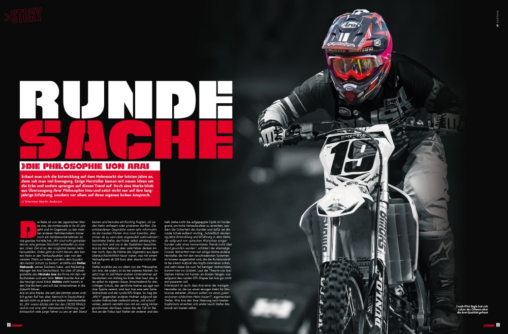 Der Helm-Sektor ist ein stark umkämpfter Wirtschafts-Zweig, indem immer wieder neue Technologien auf dem Markt erscheinen. Für den Kunden ist es oft schwierig diese Technologien in puncto Sicherheit miteinander zu vergleichen und auch wir maßen uns diesbezüglich keine Bewertung an. Ein Hersteller, der auf sensationell neue Technologien verzichtet und an seiner traditionellen aber durchdachten Philosophie festhält ist Arai. Ist das nun antiquiert oder gar nicht so schlecht? Wir haben uns mit Stefan Makowski von Arai Deutschland über deren Firmen-Philosophie unterhalten und einige interessante Theorien rund um das Thema Helm von ihm erfahren.