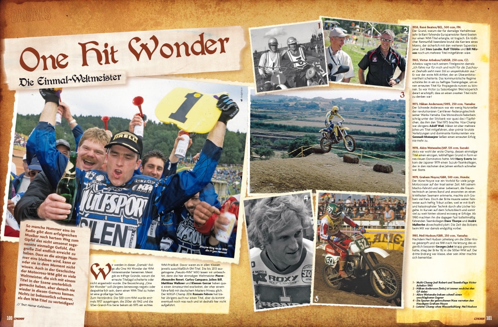 Auch wenn der Begriff „One Hit Wonder“ eigentlich eher in der Musik auftaucht, lässt sich diese Bezeichnung durchaus auch auf die MX-Weltmeisterschaft übertragen, was von uns alles andere als negativ gemeint ist. Denn auch die Einmal-Weltmeister mussten schließlich erst mal ihren Titel gewinnen! Doch es gab meist auch triftige Gründe dafür, dass sie diesen großartigen Titel kein zweites Mal einfuhren. In unserem Damals-Spezial haben wir diesen Personenkreis zusammengestellt und erläutern, warum ein zweiter Titel für die jeweiligen Piloten nicht realisierbar war. Unsere Zeitreise beginnt im Jahr 1958 und umfasst sage uns schreibe 27 One Hit Wonder, für die eine Wiederholung dieses Erfolges aus den verschiedensten Gründen unmöglich war.