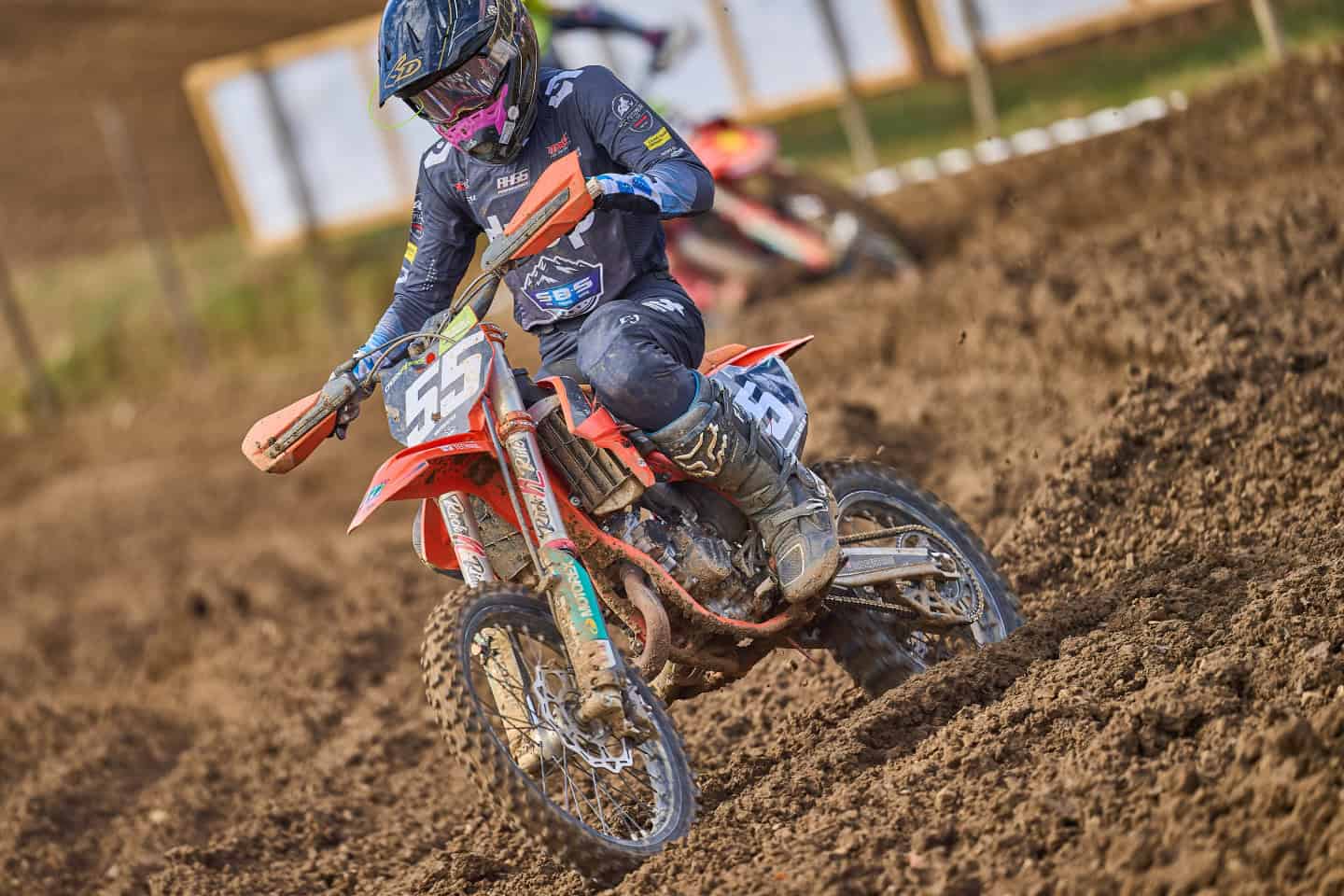 Im zweiten Wertungslauf der Königsklasse wurde das Publikum dann mit Spannung pur belohnt. Malik Schoch stand nicht nur wieder am Startgatter, sondern holte sich direkt den Holeshot. Kurz darauf übernahm jedoch erneut Löb die Führung, die er bis ins Ziel nicht mehr abgab und diesmal mit sieben Sekunden Vorsprung gewann. Der wahre Höhepunkt spielte sich dahinter ab: Der angeschlagene Schoch kämpfte bis zur letzten Runde um Platz zwei – und das ausgerechnet gegen einen völlig entfesselten Edward Hübner (NGMX). Der Enduro-Spezialist peitschte seine KTM EXC kompromisslos durch die tiefen Rillen und setzte wiederholt Attacken. Erst in der allerletzten Runde gelang es ihm, an Schoch vorbeizuziehen und seine überragende Kondition auszuspielen. Ein Ritt, der den Fans ein breites Grinsen ins Gesicht zauberte. Robin Lang und Robert Riedel komplettierten die Top Fünf als Vierter und Fünfter.