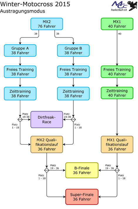 Im Klartext: Zwei Gesamtsieger in zwei Rennklassen in insgesamt vier Rennläufen zu ermitteln, dieser seit 44 Jahren praktizierte Rennmodus hat ausgedient. Am 15. März wird der Sieg beim Frühjahrsklassiker in einem alles entscheidenden Super Finale ausgefahren. Den Weg dorthin müssen sich die 36 Piloten der MX1-Klasse (450 ccm) und die 72 Fahrer der MX2-Kategorie (250 ccm) – wie im Supercross – über Vorläufe bahnen.