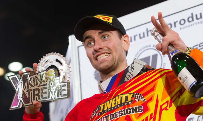 Charles Lefrancois ist der ungekrönte König des zweiten und damit letzten Veranstaltungstages beim Kings of Xtreme Supercross 2014. Mit seinen Siegen im SX1-Finale und im abschließenden Superfinale der beiden Männerklassen hätte sich der fürs Team Twenty Suspension Suzuki fahrende Franzose diesen Titel am Samstag mehr als verdient gehabt. Während der Däne Stefan Kjer Olsen vor den ausverkauften Rängen der Leipziger Messehalle 1 erneut die SX2 dominierte, gab Larissa Papenmeier-Picoto bei den Damen wieder klar den Ton an.