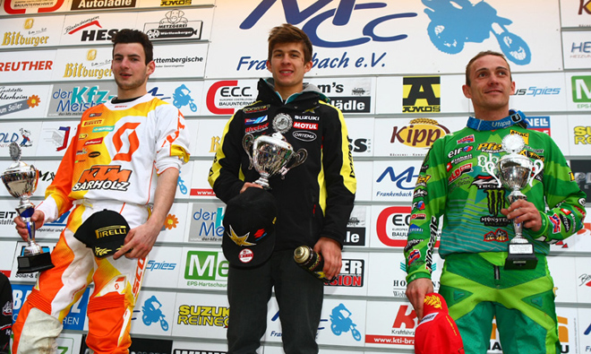 Die „Prinzengarde“ der MX2 wurde in Frankenbach vom Pfeil-Kawasaki-Piloten Sulivan Jaulin dominiert. Der Franzose, der bereits im Pflichttraining als Schnellster seiner Klasse auf dem Rennkurs unterwegs war, beanspruchte sowohl im ersten als auch im zweiten Wertungslauf den Laufsieg für sich und durfte damit bei der abschließenden Siegerehrung aufs oberste Treppchen klettern.