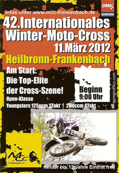 Nachdem wir am vergangenen Wochenende im sachsen-anhaltinischen Dolle einen ersten Eindruck von den Qualitäten einiger Motocross-Piloten im Sand erhalten haben, steht uns bereits am kommenden Sonntag auf der Rennstrecke „Am Pfauenhof“ in Heilbronn-Frankenbach mit der 42. Auflage des Internationalen Winter-Motocross des MCC Frankenbach e.V. der zweite deutsche Saisonauftakt des Jahres 2012 ins Haus. Und diesmal gilt es für die Teilnehmer auf Hartboden eine Kostprobe ihres derzeitigen Leistungsstands abzuliefern.