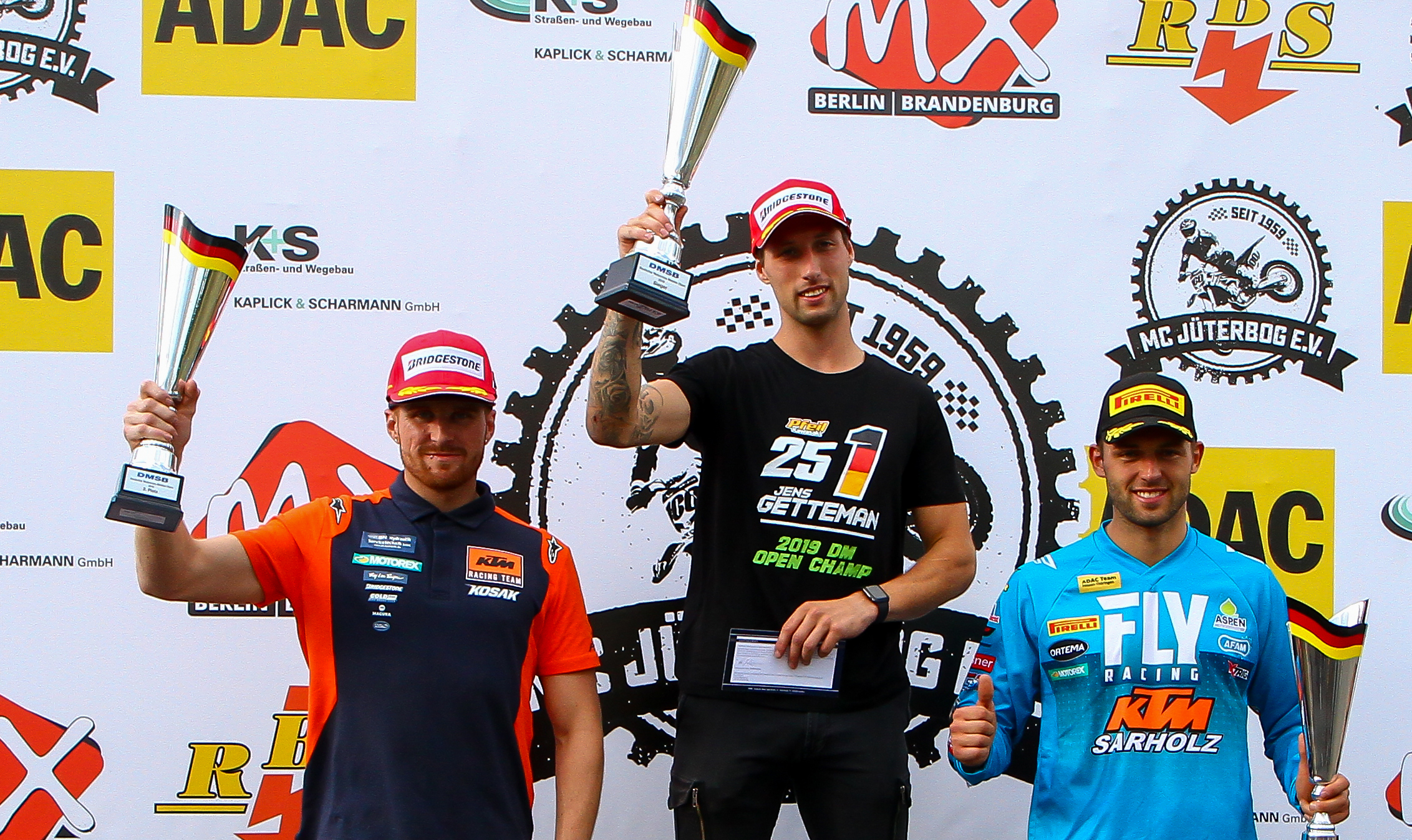 Auch in Durchgang zwei war es wieder Stefan Ekerold, der sich den Holeshot schnappte und das Fahrerfeld in die erste Runde führte. Nur diesmal klebte ihm Jens Getteman an seinem Hinterrad, der nur auf den geeigneten Moment wartete, um in Runde zwei in meisterlicher Manier mit hohem Tempo an Ekerold vorbeizuziehen und ihm das Zepter des Handelns zu entreißen. Dies gab Getteman bis zum Schluss auch nicht mehr aus der Hand und sicherte sich nicht nur den Laufsieg, sondern final auch die erfolgreiche Titelverteidigung. Mit gut neun Sekunden Abstand bekam der an diesem Wochenende bestens aufgelegte Thüringer Tim Koch, der gegen Ende der ersten Rennhälfte den Weg an Ekerold vorbeigefunden hatte, die Zielfahne als Zweiter zu sehen und sicherte sich damit in der Konsequenz seinen ersten Tagessieg in der diesjährigen DM Open und letztlich noch Platz drei in der Meisterschaft.