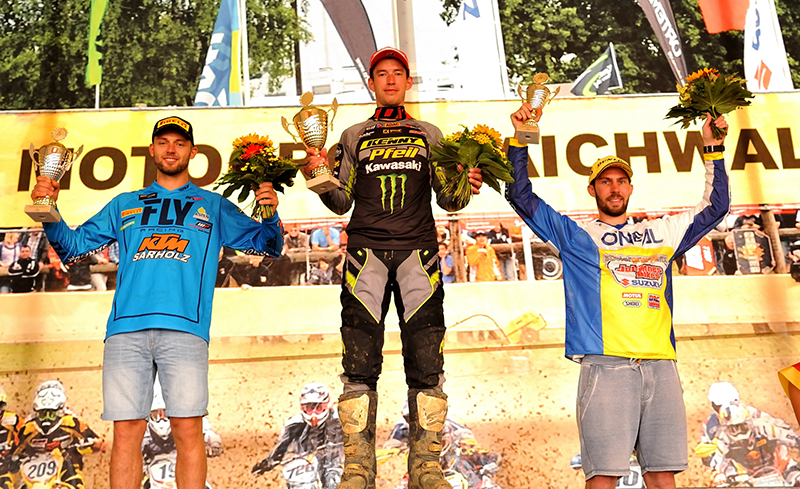 Sehr spannend und knapp ging es schon in der Qualifikation am Samstag zu. Boris Maillard mit der stielergruppe.mx Johannes Bikes Suzuki knallte mit sechs Hundertstelsekunden Vorsprung die schnellste Runde, vor dem Tabellenführer Jens Gettemann vom Monster Energy Kawasaki Elf Team Pfeil, auf den Wiesenboden im Schurwald. Filip Neugebauer komplettierte die Top drei.