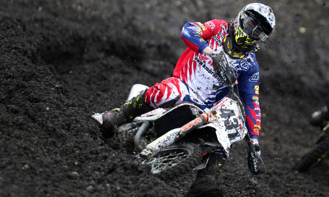 Am Sonntag sollte dann das eintreffen, was zuvor bereits sämtliche Wetterberichte angekündigt hatten: Regen, Regen und nochmals Regen. Während die Strecke am Samstag noch ein Traum war, setzte der Regen am Sonntag der Strecke stark zu und forderte den Piloten einiges ab. Dies schien Kasper Jensen in die Karten zu spielen. Der Däne startete sehr gut ins erste Rennen und war als Zweiter direkt vorn mit dabei. Kasper bestätigte seine Leistung aus der Qualifikation nicht nur, er übertraf sie sogar noch und beendete den ersten Durchgang noch vor einigen WM-Piloten oder dem ADAC MX Masters Titelverteidiger als Dritter. Im zweiten Durchgang sah es zunächst wieder gut aus für Kasper: Erneut bog er als Zweiter aus der ersten Kurve und konnte sich lange auf dem vierten Rang halten. Zur Rennmitte rutsche ihm leider direkt vor der Box das Vorderrad weg und Kasper musste zu Boden. Danach war der Sonderborger so von der Rolle, dass mehr als der 17. Rang nicht drin war. Mit Tagesrang neun und Tabellenplatz 13 ist Kasper nun bester Honda-Pilot im Feld.