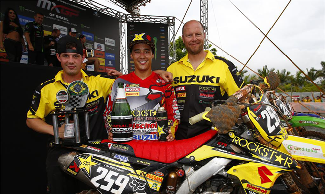 Auch in der MXGP Weltmeisterschaft gelang mit Clément Desalle (Rockstar Energy Suzuki World MXGP) erneut einem Suzuki-Piloten der Sprung aufs Siegertreppchen. Der Belgier landete in beiden Rennen auf Platz 3 und belegte damit den zweiten Rang in der Tageswertung. Desalle verbesserte sich in der WM-Zwischenwertung auf den vierten Platz. "Es war für mich nicht einfach, nach meiner Schulterverletzung wieder ganz vorne mitzumischen", schilderte Desalle die Situation nach einer langen Verletzungspause vor der aktuellen WM-Saison. "Ich bin in Brasilien erneut auf dem Podium gelandet, deshalb bin ich zufrieden mit meinem Auftritt. Ich möchte die Gelegenheit nutzen, um mich bei meinem Team zu bedanken. Alle haben in den letzten Wochen wirklich hart gearbeitet, damit wir uns weiter verbessern konnten."