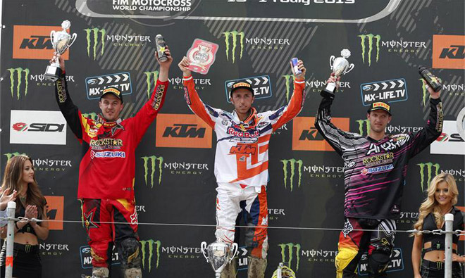 Clément Desalle vom Team Rockstar Energy Suzuki World präsentierte sich auf dem für ihn unbekannten Gelände in prächtiger Form. Der Belgier konnte am Samstag das Rennen zur Qualifikation gewinnen und sich so den besten Startplatz für die beiden Wertungsläufe am Sonntag sichern. Diesen nutzte der 24-Jährige auch, um sich direkt an die Spitze des Feldes zu setzen und das Rennen lange Zeit anzuführen. „Es war hilfreich, dass ich die Pole Position hatte“, freute sich Desalle. „Wenn man von Beginn an vorne ist, fällt vieles leichter. Dass ich den Sieg nicht nach Hause bringen konnte ist ärgerlich, aber mit Rang zwei bin ich schon mal einen Platz weiter vorne als bei den letzten Rennen.“ In Durchgang zwei landete Desalle hinter seinem Teamkollegen Kevin Strijbos auf dem dritten Platz.