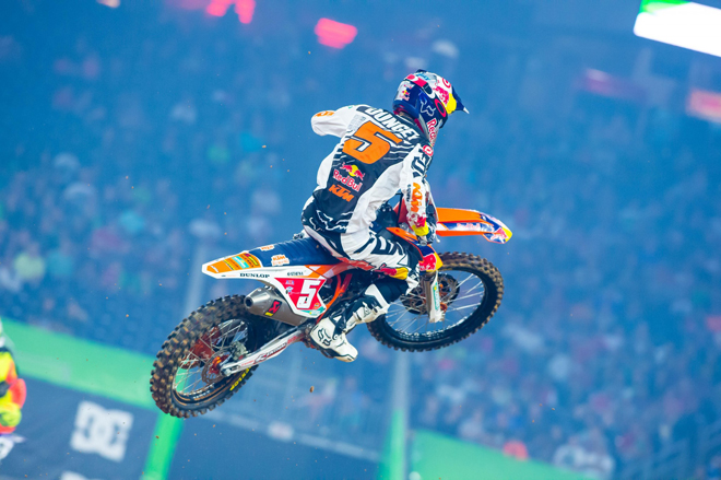 Als das Startgatter zum Hauptrennen fiel, wurde Ryan Dungey in der ersten Kurve abgedrängt und lag zunächst außerhalb der Top 10. Er verschwendete aber keine Zeit und machte mit seiner KTM 450 SX-F Factory Edition Position um Position gut. Zur Halbzeit des Rennens hatte er sich schon bis auf Platz 6 nach vorne gearbeitet. In den nächsten Runden erhöhte er das Tempo und kämpfte sich bis auf den zweiten Rang vor. Diese Position konnte er bis ins Ziel locker halten und damit den Titel in der 450 Supercross Meisterschaft einfahren, der allererste für KTM.