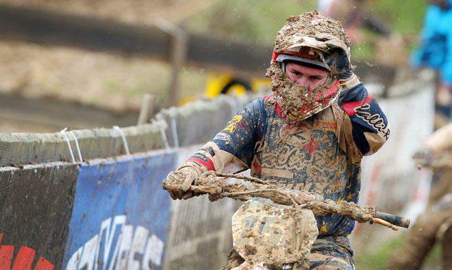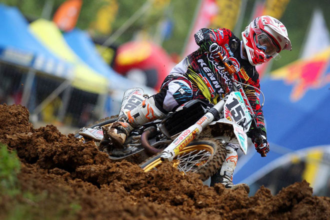 „Beim ersten Start habe ich gut reagiert und konnte aus dem Startgatter mit dem Vorderfeld mitgehen. Doch schon auf der Startgerade bekam ich so viel Schlamm auf die Brille das es mit der freien Sicht vorbei war. Bis ich das sortiert und die Brille abgestreift hatte, lag ich im hinteren Teil des Feldes. Ohne Brille ging es an die Aufholjagd und der Schlamm der vorausfahrenden Piloten bombardierte mein Gesicht und die Augen. Trotzdem arbeitete ich mich konsequent nach vorne und hatte die Top-10 im Blick. Dann ging es auf der schmierigen Piste jedoch zweimal zu Boden und das war´s. Zwar beendete ich das Rennen, aber für Rang einundzwanzig gibt es halt keine Punkte. Der zweite Start war ok, ich war in den Top 10 und arbeitete mich zügig weiter nach vorne. Schon in den Top-5 angekommen, traf mich ein aufgewirbelter Stein im Gesicht. Er durchschlug die Brille und das Brillenglas traf mitsamt Stein mein Auge. Das Auge war im wahrsten Sinne des Wortes angeschlagen und nach einem kurzen Stopp ging es die Helferbox. Mit neuer Brille versuchte ich nochmal anzugreifen, aber das war einäugig im tiefen Schlamm ein sinnloses Unterfangen. So musste ich das Rennen vorzeitig beenden und blieb zum zweiten Mal an diesem Tag ohne Meisterschaftszähler. Das ist natürlich die Höchststrafe wenn du hier mit als Führender der Meisterschaft anreist. In den Rennen habe ich mich wesentlich besser wie in den Trainings gefühlt, aber dafür gibt es eben auch nix. Am Ende zählen die Punkte und das war heute eine Nullrunde. Ein wenig brauche ich noch, aber dann heißt es abhaken und nach vorne schauen. Zum Glück gibt es noch sechs Runden um das Ganze zu korrigieren.“
