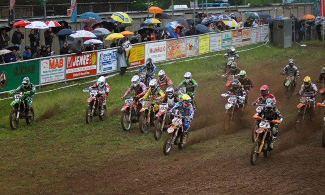 Zum Start des ersten Wertungsrennens der DM Open war der Himmel zwar bewölkt, aber es fiel noch kein Regen. Jan und Dominique starteten eher suboptimal. Jan stieß mit einem anderen Piloten zusammen, rutsche ausgerechnet vor das Rad von Dominique und beide MX-Team KTM Sturm Piloten lagen am Boden. Dominique kam als Vorletzter wieder los und Jan musste sich ganz am Ende des Feldes einsortieren. Während Dominique sich wieder nach vorne kämpfte und im Ziel Platz 16 erreichte, schlug bei Jan der Defektteufel zu. Gerade wieder in den Punkten angekommen, streikte das Motorrad und Jan musste das Rennen aufgeben.