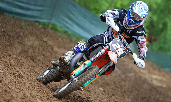 Schon bei der Anreise zeigten sich dunkle Regenwolken und bei der Ankunft am Reutlinger Renngelände gab es lange Gesichter. Die vom Veranstalter im Vorfeld hervorragend präparierte Hartboden-Rennstrecke „Am Sportpark“ hatte sich in eine Schlammwüste vom Feinsten verwandelt und selbst im Fahrerlager stand knöchelhoch das Wasser. Am Samstagmorgen ging es ins freie Training und zum Glück hatte der Wettergott zunächst ein Einsehen und die Bedingungen besserten sich ein wenig. Im freien Training betrieb der ehemalige Junioren-Weltmeister Streckenstudium und stellte sich und die Sarholz-KTM auf die schwierigen Bedingungen ein. Als es dann am Mittag in der Qualifikation zum ersten Mal Ernst wurde, zeigte der 16-Jährige eine taktische Meisterleistung. Gleich zu Beginn fuhr er eine schnelle Runde und konnte sich damit lange Zeit auf dem zweiten Rang behaupten. Am Ende reichte dies zum tollen siebten Platz und einer damit sehr guten Ausgangsposition am Startgatter.