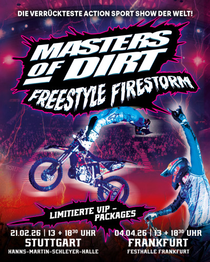Masters of Dirt entfacht 2026 den „Freestyle Firestorm“ in Deutschland! Bei zwei weiteren Shows am 21.02.2026 um 18:30 Uhr in Stuttgart und am 04.04.2026 um 18:30 Uhr in Frankfurt bieten die weltbesten Freestyle-Athleten exklusiv bei M.O.D Actionsport-Family-Entertainment vom Feinsten und verwandeln die Arenen in eine Welt des Unfassbaren! Tickets gibt es ab Montag, 15.09.2025, ab 12:00 Uhr exklusiv unter www.eventim.de und ab dem 17.09.2025 an allen bekannten Vorverkaufsstellen.