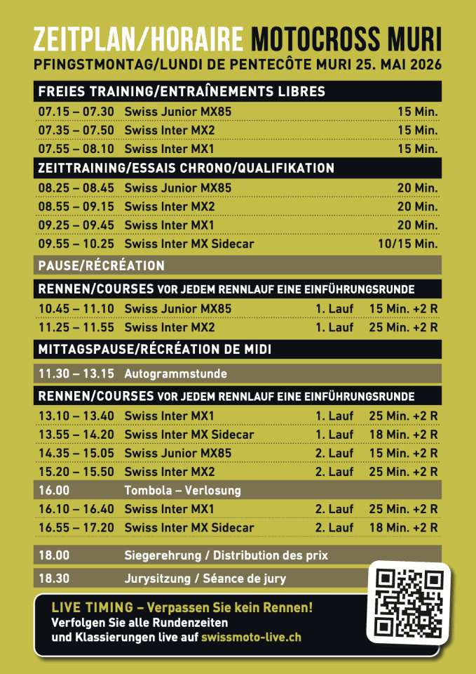 Neben der Königsklasse treten in Muri außerdem die MX2 sowie die Nachwuchstalente der 85er-Klasse und die Seitenwagen an. Es deuten also alle Zeichen auf ein wahres Motocross-Fest am Pfingstmontag hin, welches ihr euch nicht entgehen lassen solltet.