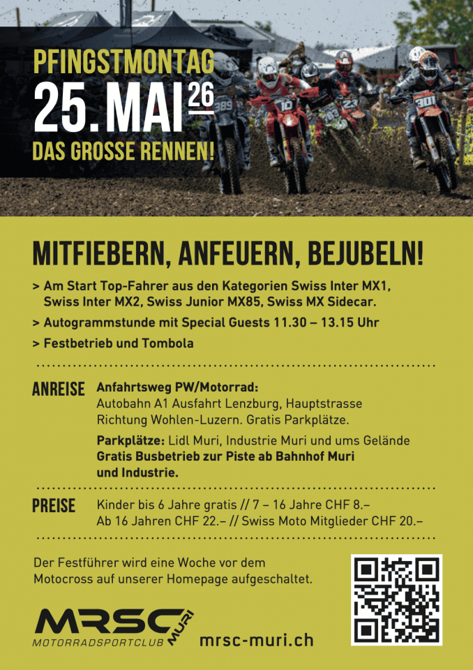 Tickets für das Rennspektakel am 25. Mai gibt es bereits ab 8 CHF für Ermäßigte und ab 22 CHF für Erwachsene. Weitere Informationen zur Veranstaltung findet ihr im Überblick auf dem folgenden Flyer sowie auf www.mrsc-muri.ch.