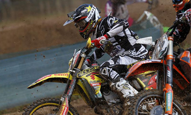 Clement Desalle und Tanel Leok kämpften sich am Sonntag beide bei Schauern vor 21.000 Fans durch schwierige Rennbedingungen. Sie erreichten Platz sechs und sieben bei der zehnten von insgesamt 16 Runden zur FIM Motocross Weltmeisterschaft.