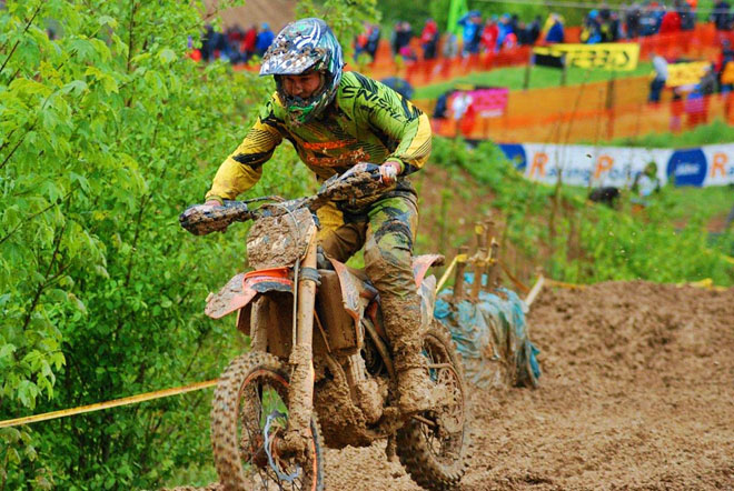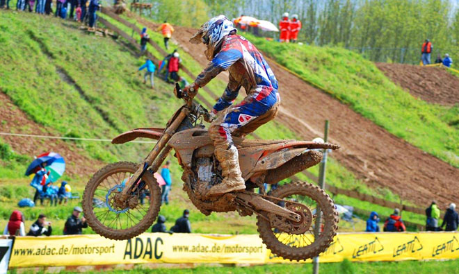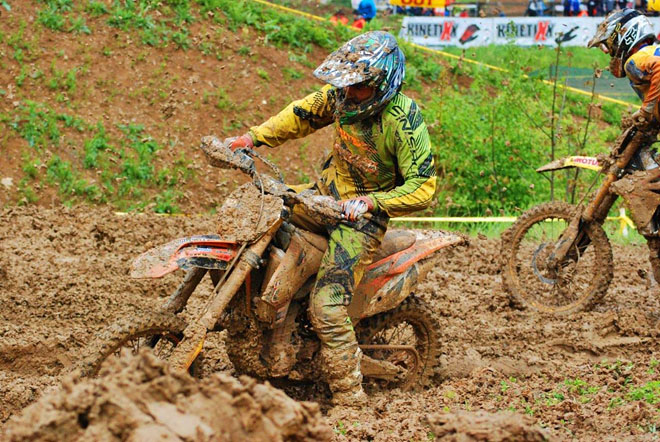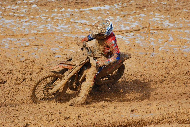 Diesmal kam der nächste Schauer pünktlich zum zweiten Lauf. Gerade als wir uns am Gatter aufreihten öffnete der Himmel wieder seine Pforten. Diesmal war es ganz schön eng in der ersten Kurve, aber dennoch kam ich auf Platz 5 aus der ersten Runde. Ich musste später nach einem unfreiwilligen Ausritt aus der Strecke Tim Gajser ziehen lassen. Mein Speed war richtig gut, durch einen Sturz von Nagl war ich auf Platz 5 vorgerutscht und nach hinten hatte ich schon über eine Minute Vorsprung.