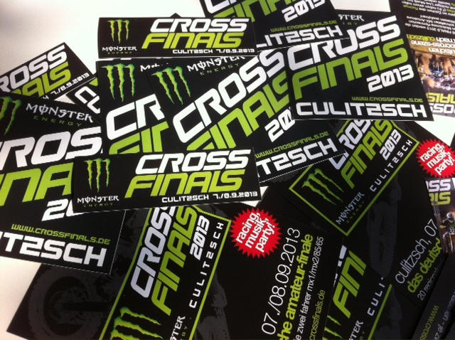 Während Ken Roczen gerade in seine verdiente Party-Nacht feiert, steht bei uns schon wieder die Sonne am Himmel! Wir sind heute in Culitzsch, um quasi eine kleine Generalprobe für die Monster Energy CROSS FINALS 2013 abzuhalten. An unserem Stand gibt es nicht nur gratis Monster Energy, ihr dürft euch dort auch die neuen CROSS Finals Sticker mitnehmen!