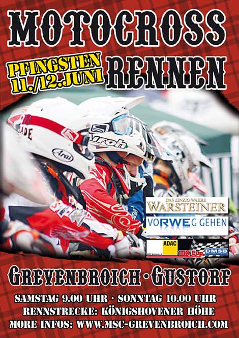 Am kommenden Pfingstwochenende (11./12.Juni) gastiert der ADAC Nordrhein MX-Cup beim MSC Grevenbroich. Auf der Rennstrecke Königshovener Höhe wird bereits die vierte Runde der bei Fahrern beliebten Meisterschaft ausgetragen. Die Vorbereitungen durch die Mitglieder des MSC Grevenbroich laufen schon seit einigen Wochen auf Hochtouren und so wird den Teilnehmern wieder eine perfekt präparierte technisch anspruchsvolle Sandstrecke geboten.