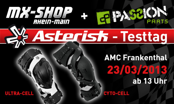 Am Samstag, den 23. März, habt ihr die Möglichkeit, beim MX-Shop Rhein-Main in Zusammenarbeit mit dem Asterisk-Importeur Passion-Parts die Asterisk Ultra-Cell und die brandneue Cyto-Cell zu testen. Und zwar nicht nur einfach anprobieren, sondern richtig damit fahren. Somit braucht ihr nicht die Katze im Sack kaufen.