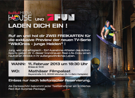 So ihr zwischen 13 und 29 Jahre alt seid, Interesse an Funsportarten habt und schnell reagiert, habt ihr die einmalige Möglichkeit zusammen mit einer Begleitperson auf der Gästeliste für das am 11. Februar 2013 im Münchner Mathäser Filmpalast durchgeführte exklusive Preview dieser ProSieben Fun TV-Serie zu stehen. Als kleines Dankeschön für die Teilnahme an dieser Testvorführung und das anschließende Ausfüllen eines Fragebogens erhält jeder geladene Gast ein limitiertes Red-Bull-Surprise-Package im Wert von 70 Euro!