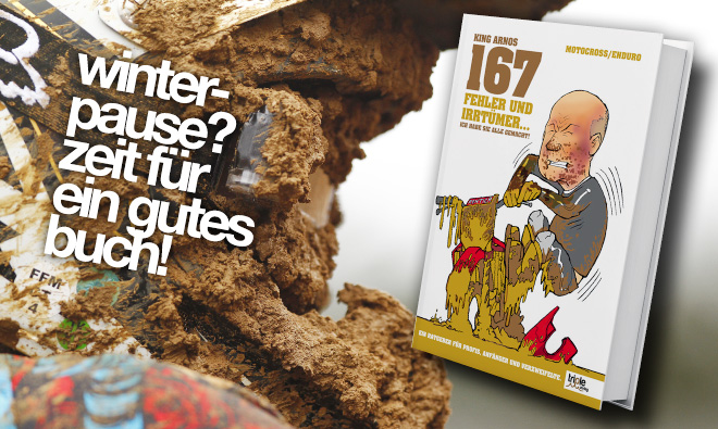 Weihnachten steht vor der Tür, und wie es der Zufall will, auch King Arnos Buch "167 Fehler und Irrtümer – ich habe sie alle gemacht". Aufmerksamen Lesern unseres Magazines werden die satirisch bissigen Storys des "MX-Späteinsteigers" sicherlich nicht unbekannt sein. Und nun sind seine Erfahrungen und Abenteuer rund um das Thema Offroad endlich auf 240 Seiten im handlichen DIN A5-Format erhältlich.