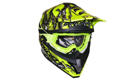 Ab sofort gibt es den neuen VX15-Helm von Scorpion EXO in der Oil-Version auch in einem alles überstrahlenden Neongelb und als Combo mit der passenden 100% Accuri-MX-Brille.