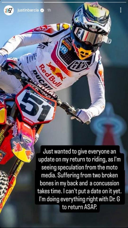 „Ich wollte euch allen ein Update zu meiner Rückkehr auf das Motorrad geben, da ich Spekulationen aus den Moto-Medien sehe. Zwei gebrochene Knochen in meinem Rücken und eine Gehirnerschütterung brauchen Zeit. Ich kann noch kein Datum nennen. Ich mache alles richtig mit Dr. G, um so schnell wie möglich zurückzukommen.“