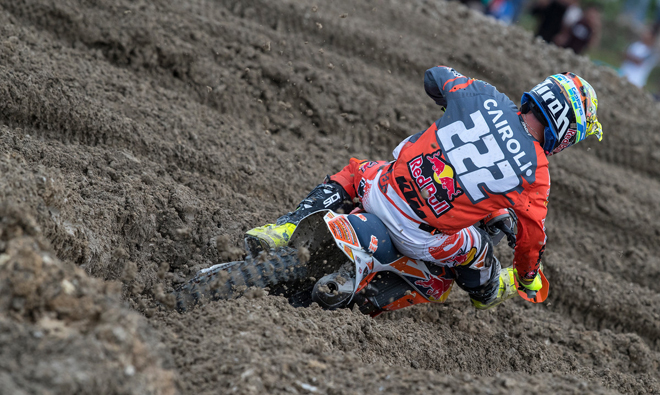 Der amtierende Champion Antonio Cairoli stürzte im zweiten Lauf auf eher unspektakuläre Art und Weise, hat nun jedoch mit einer geschwollenen Hand mit Bluterguss zu kämpfen. Ob er am nächsten Wochenende zwangsläufig wie sein Rivale Jeffrey Herlings angeschlagen an den Start wird gehen wird?