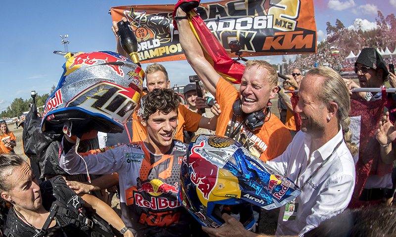 Ein Sieg im ersten Wertungsrennen des am vergangenen Wochenende in Uddevalla ausgetragenen sechzehnten von insgesamt achtzehn Grands Prix der FIM Motocross Weltmeisterschaft 2019 reichte Jorge Prado um seinen im Vorjahr erkämpften MX2-Titel erfolgreich zu verteidigen. Dabei wird der erst 18 Jahre junge Spanier als der Fahrer in die Geschichtsbücher eingehen, der die MX2-WM in diesem Jahr klar dominierte.