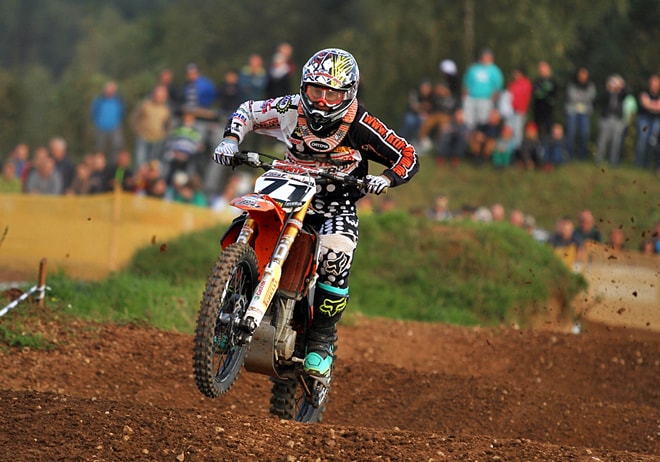 Wie einige von euch mitbekommen haben, ging es am vergangenen Sonntag um den Titel in der Deutschen MX Open Meisterschaft im sächsischen Thurm. Ich reiste zwar als Tabellenzweiter mit sechs Punkten Rückstand auf Marcus Schiffer an, aber dieser konnte verletzungsbedingt nicht teilnehmen. So hieß es nur noch, Boris Maillard oder ich. Er lag 17 Punkte hinter mir und das war eine recht komfortable Ausgangsposition. Trotzdem soll man den Tag nie vor dem Abend loben und so ging ich mit der Devise „Angriff ist die beste Verteidigung“ in den Renntag.